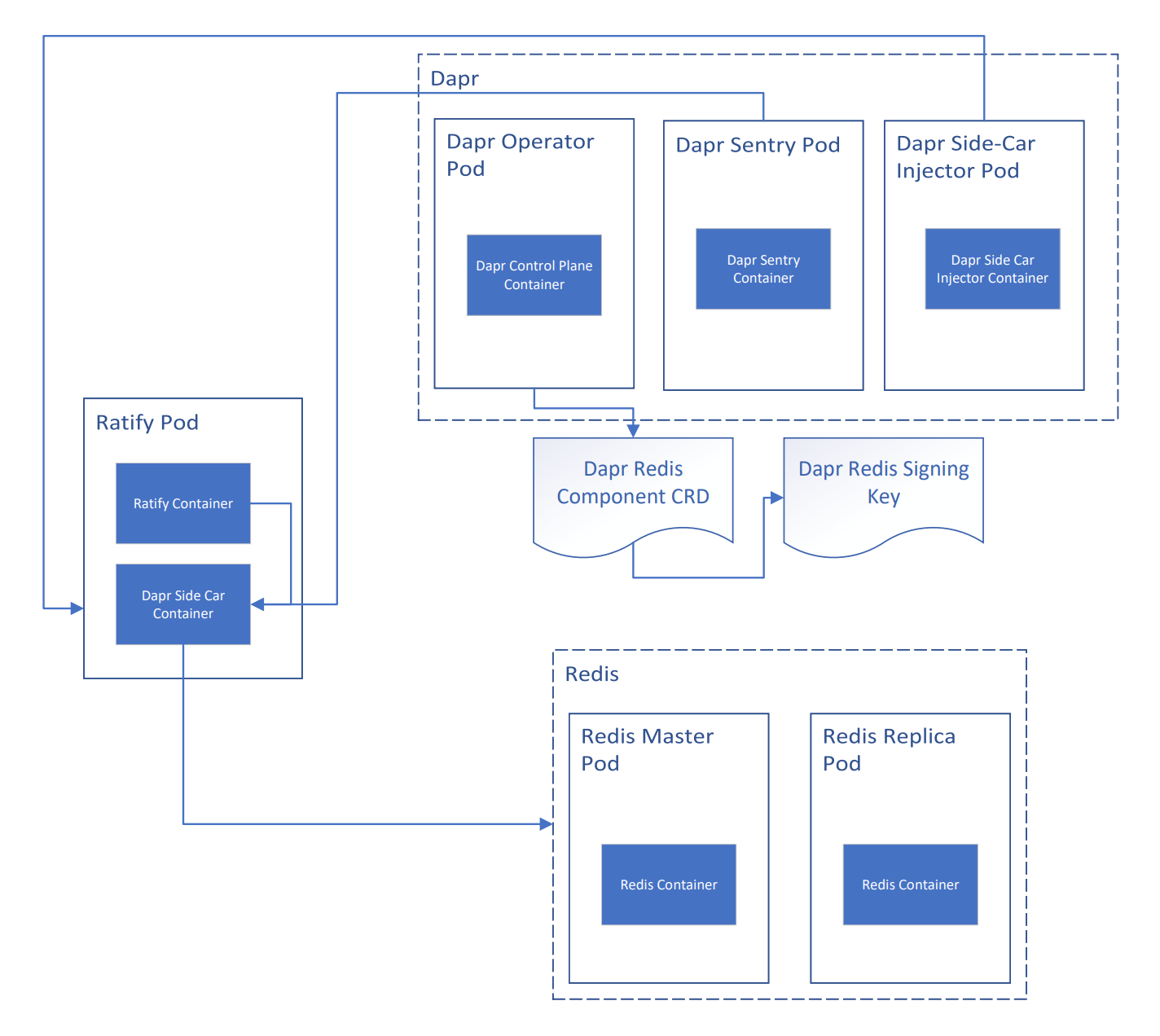Here's a diagram of the relationship between the cluster resources installed with Dapr + Redis + Ratify: